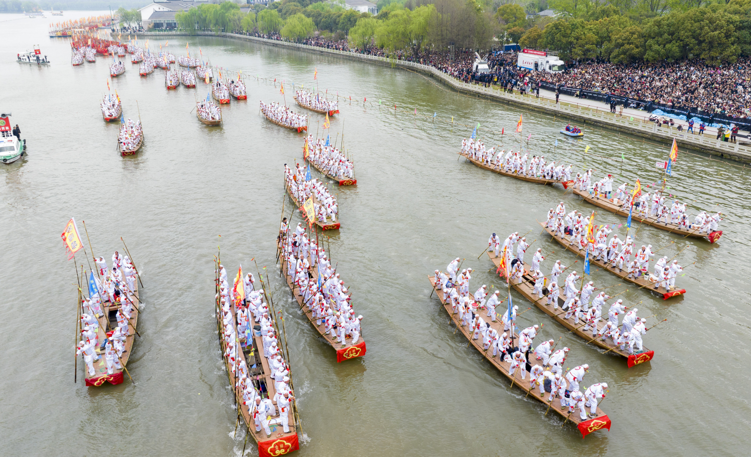 湖面上,裝飾一新的貢船、龍船、篙子船、劃子船列隊行進,鏗鏘的鑼鼓聲,船槳的撞擊聲,水手的吶喊聲,彼此起伏。 湖岸上,川流不息的人流,爭相目睹“天下會船數溱潼”的壯觀,爽朗的歡笑聲,悠揚的歌聲,聲聲入耳。 4月6日,2024溱潼會船在泰州市姜堰區國家溱湖濕地公園激情上演,展現了古老非遺會船文化獨特的韻味與活力城市時代交融的魅力。