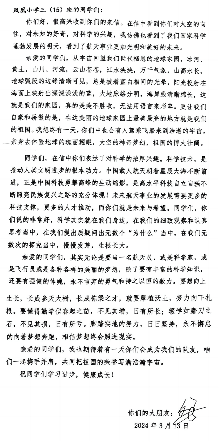 用航天精神點亮少年夢想,航天員劉洋給泰州鳳凰小學的孩子們回信