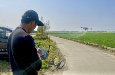 4月24日,興化市戴窯鎮種糧大戶馬月燦訂購的一批化肥直接送到了地頭,他的無人機立即裝料起飛播撒化肥。他告訴記者,現在鄉村道路等級高,而且四通八達,種糧、賣糧方便得很。