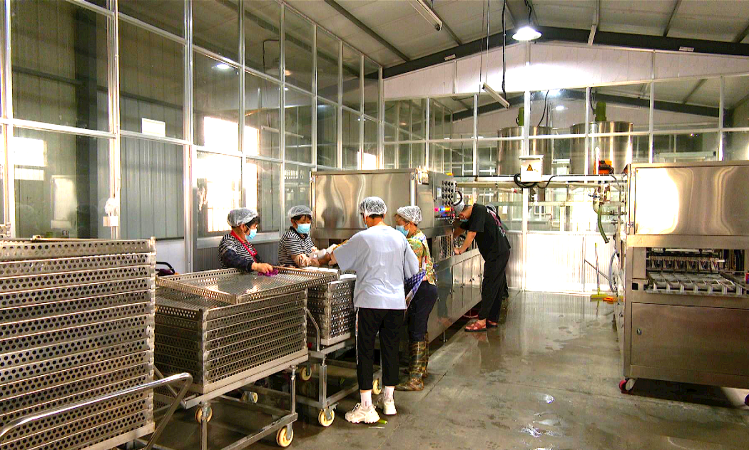 夏港村通過引進種植大戶,成立農(nóng)民專業(yè)合作社,以“訂單農(nóng)業(yè)”推進特色種植產(chǎn)業(yè)化發(fā)展。一年種兩茬,一茬畝產(chǎn)能達2500斤,市場價格可達4元一斤。優(yōu)質(zhì)的毛豆主要銷往浙江、上海等地,深受客戶喜愛。小小的毛豆,正成為當?shù)卮迕裨鍪罩赂坏?ldquo;金豆”。 多措并舉,新型農(nóng)村集體經(jīng)濟蓬勃發(fā)展 近年來,泰興市堅持走新型農(nóng)村集體經(jīng)濟發(fā)展之路,加快構(gòu)建產(chǎn)權(quán)關(guān)系明晰、經(jīng)營方式穩(wěn)健、權(quán)能結(jié)構(gòu)完整的運行新機制。以村集體為基本單位,將集體經(jīng)濟和民營經(jīng)濟有機結(jié)合,激發(fā)農(nóng)村各類經(jīng)濟組織創(chuàng)造新產(chǎn)業(yè)、新業(yè)態(tài)、新模式。 分界鎮(zhèn)滕興村經(jīng)過市場調(diào)研,與泰興市鵬程禽蛋專業(yè)合作社深度合作,建設(shè)了占地5畝的標準廠房,引進了一條配套的鴨血鴨雜加工生產(chǎn)線,打通了禽類副產(chǎn)品加工渠道。這一舉措不僅為企業(yè)帶來了可觀的收益,也為村集體帶來了穩(wěn)定的增收。據(jù)滕興村黨總支書記、村委會主任楊俊健介紹,企業(yè)每年上繳4萬元的標房租金給村里,并按照企業(yè)利潤的5%上繳給村集體,使得村級增收達到5.5萬元。