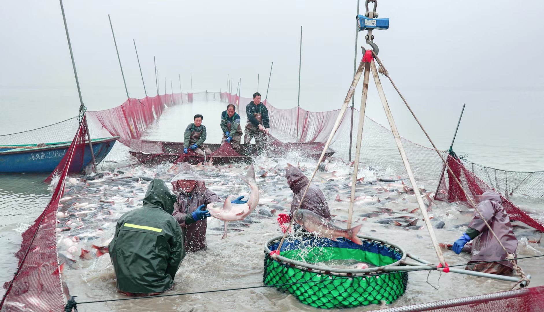 沙溝水產(chǎn)品交易市場是江蘇省最大的淡水產(chǎn)品原產(chǎn)地批發(fā)市場,輻射周邊地區(qū)10多個鄉(xiāng)鎮(zhèn),帶動面積近100萬畝,水產(chǎn)品銷往全國各地,并遠銷韓國、俄羅斯等國。當?shù)氐?ldquo;一條魚”,不僅富了養(yǎng)殖業(yè),興了加工業(yè),也帶動了旅游業(yè)發(fā)展,為興化打造新時代“魚米之鄉(xiāng)”添了一筆亮彩。 “智”上引領,養(yǎng)殖業(yè)轉(zhuǎn)型升級 “如果不是今天捕魚,現(xiàn)在投餌根本不出家門,直接手機操作,還可以看到魚塘的實時畫面。”養(yǎng)殖戶王金友說。 作為有著30多年經(jīng)驗的養(yǎng)魚戶,以前最讓王金友頭疼的就是喂魚。一袋袋菜籽餅搬到船上,用鐵鍬拌勻,一鍬鍬撒到水塘,每天成百上千斤的魚食,“哪怕是冬季,一到喂魚時那汗出的,衣服就沒有干過。”
