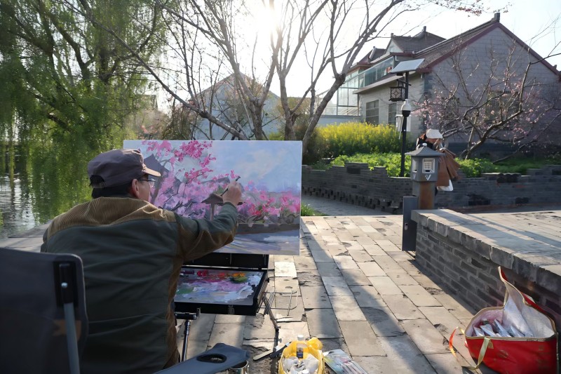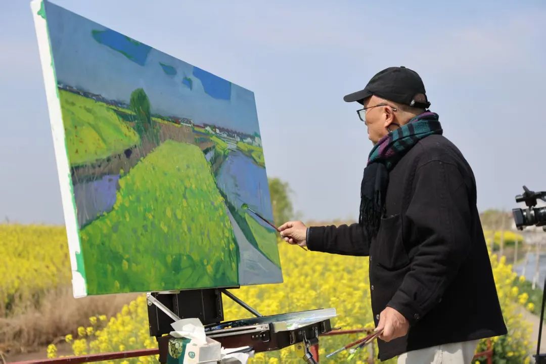 4月3日,天氣晴好,漫步東羅村,處處皆成畫卷:蜿蜒的村道旁,白墻黛瓦的民居與碧水相映成趣;轉(zhuǎn)過一道彎,金黃的油菜花田與古樸的石橋構(gòu)成絕妙景致,真正是“一步一景,移步換景”的絕佳寫照。一級美術(shù)師、中國寫意油畫研究院院務(wù)委員唐滿生不禁感嘆:“泰州勝江南!從前總以為小橋流水、煙雨朦朧的景致只能在江南得見,沒想到在泰州,也能看到這江南的水鄉(xiāng)韻味。” 望著眼前層疊的千垛花田,中國美術(shù)學(xué)院教授、浙江省油畫協(xié)會副主席章曉明更是直言:“景色太美、太多,畫不完!根本畫不完!”畫至酣暢處,他索性邀來正在旁側(cè)服務(wù)的泰州市青年美術(shù)家協(xié)會副主席張昇一同作畫。