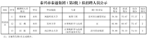 泰興市泰通集團(第2批)擬招聘人員公示表