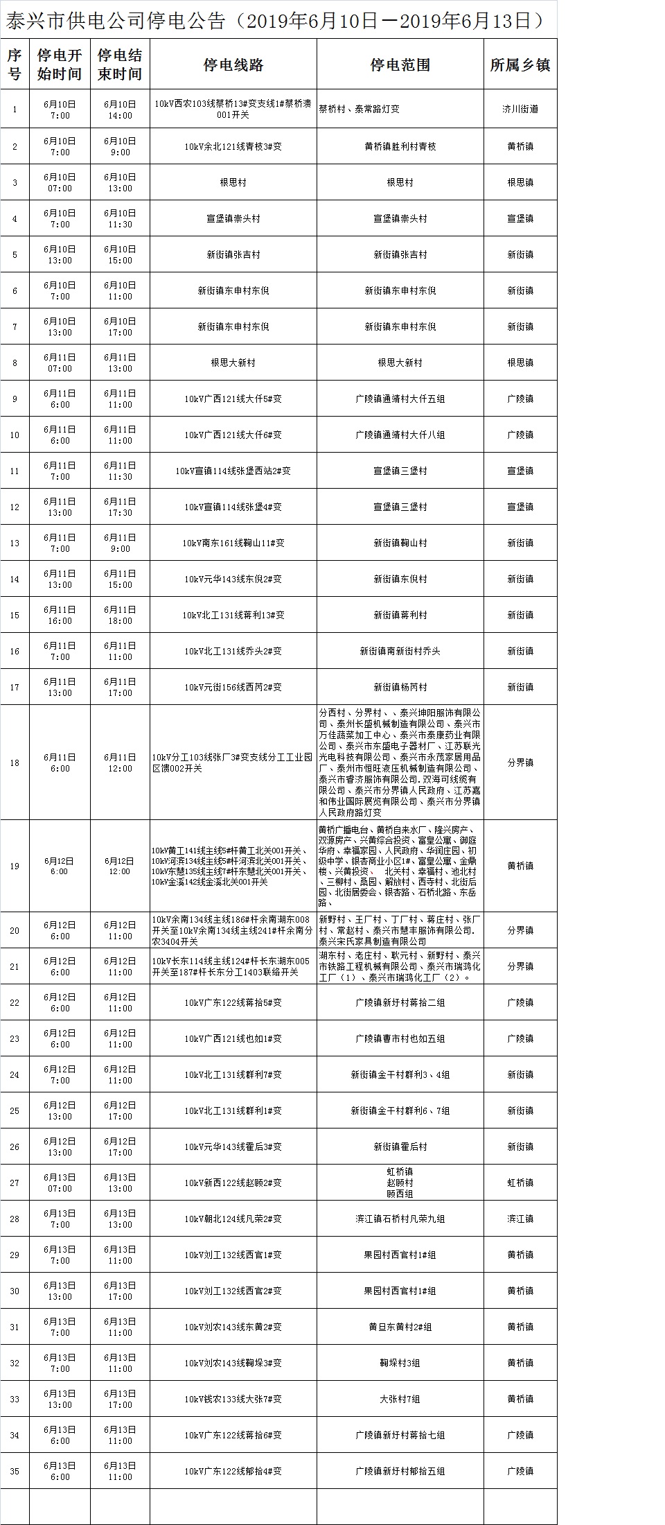 泰興市供電公司停電公告(2019年6月10日-2019年6月13日)