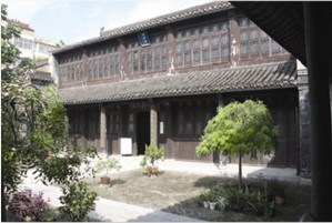 進(jìn)大門過小天井則是儀門,儀門體現(xiàn)了明代建筑簡潔明快、線條流暢的風(fēng)格。儀門門樓系磨磚砌筑,采用民間糯米汁和石灰漿粘接,灰縫細(xì)密結(jié)實(shí),至今嚴(yán)絲合縫。儀門向內(nèi),豁然開朗,穿過大天井,便是古意盎然的大廳。大廳面寬三間,南立面檐柱與廳堂之間設(shè)走馬廊檐以擴(kuò)張廳堂空間進(jìn)深。走馬廊梁柱獨(dú)具匠心,采用荷葉形木墩作點(diǎn)綴,8個(gè)墩體12個(gè)外立面無一雷同。大廳為木結(jié)構(gòu)建筑,用料精良,工藝考究,廳堂木樁為金絲楠木。廳堂構(gòu)架粗壯氣派,正梁下的云柱柱頭與承梁斗拱之間采取了透雕“抱梁云”、“山霧云”花板予以配飾,榫卯結(jié)合,相得益彰。當(dāng)年廳堂梁、枋、柱頭、斗拱等構(gòu)件上均以彩繪裝飾,至今仍依稀可見梁架上山水花鳥殘留痕跡。地面以一尺見方的磚材鋪設(shè)。大廳向后乃一大院,原建有何氏族人題名的振裔樓,后毀于火災(zāi),1992年由地方政府出資在原址重建,現(xiàn)作為陳列歷史文物的展廳。