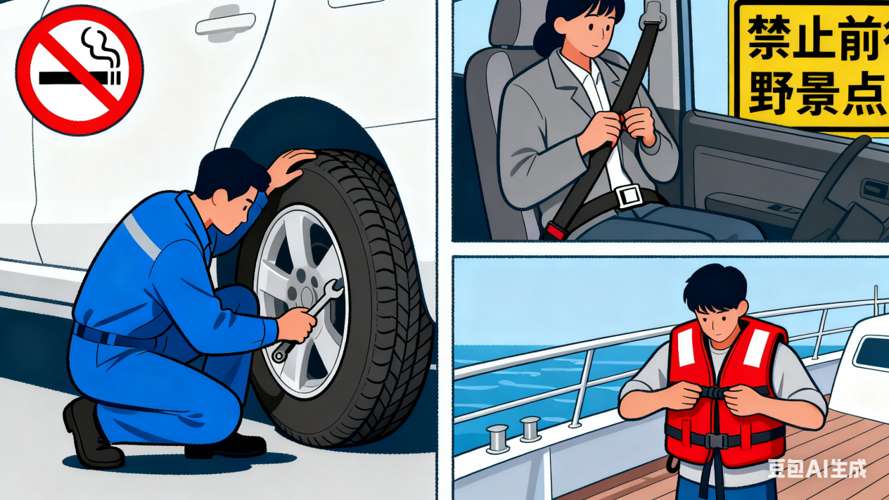 安全筑防線:自駕游前全面檢查車況,杜絕疲勞、酒后駕駛。乘坐交通工具時全程系好安全帶,乘坐游船需按規定穿救生衣。不前往未開發、缺乏安全保障的“野景點”,慎選高風險項目,注意安全用火。