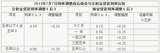 2011年7月7日利率調整前后商業與公積金貸款利率比較