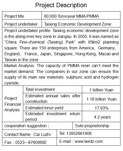 8萬噸/年MMA/PMMA(聚甲基丙烯酸甲脂)