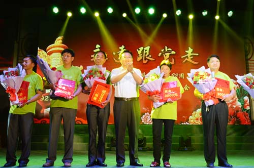 優(yōu)秀動(dòng)遷工作對(duì)象受表彰 (記者 孫紀(jì)剛)6月28日晚,江蘇中丹集團(tuán)禮堂內(nèi)旌旗招展,歌聲嘹亮。虹橋工業(yè)園區(qū)黨工委舉辦的“永遠(yuǎn)跟黨走”慶祝建黨92周年暨“雙先雙優(yōu)”頒獎(jiǎng)典禮隆重開幕,再次在區(qū)鎮(zhèn)黨員干部當(dāng)中掀起了一股爭先創(chuàng)優(yōu)的熱潮。市委常委、組織部長錢娟,市委常委、常務(wù)副市長劉榮華,副市長、虹橋工業(yè)園區(qū)黨工委書記、虹橋鎮(zhèn)黨委書記孫群觀看了精彩的文藝演出,并為部分先進(jìn)基層黨組織、優(yōu)秀共產(chǎn)黨員、先進(jìn)征地拆遷工作人員、優(yōu)秀征地拆遷對(duì)象戶頒獎(jiǎng)。