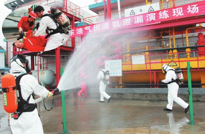 接到警報后,公司立刻啟動應急預案,并向黃橋消防中隊請求增援。救援現場,工作人員各項救援緊張有序。在防氨服、空氣呼吸器、高壓水槍等設備的輔助下,工作人員將事故險情暫時控制住。黃橋消防中隊及時趕到,消防官兵和華揚應急工作人員一道,對發生事故的液氨儲罐進行噴水稀釋。經過半小時的救援,氨氣泄漏得到了有效控制。