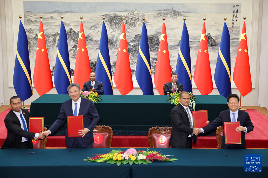 3月25日下午,國家主席習近平在北京人民大會堂同來華進行國事訪問的瑙魯總統(tǒng)阿迪昂舉行會談。這是會談后,兩國元首共同見證簽署共建“一帶一路”、落實全球發(fā)展倡議、經(jīng)濟發(fā)展、農(nóng)業(yè)等領域多項雙邊合作文件。新華社記者 劉彬 攝 會談后,兩國元首共同見證簽署共建“一帶一路”、落實全球發(fā)展倡議、經(jīng)濟發(fā)展、農(nóng)業(yè)等領域多項雙邊合作文件。 雙方將發(fā)表《中華人民共和國和瑙魯共和國聯(lián)合聲明》。