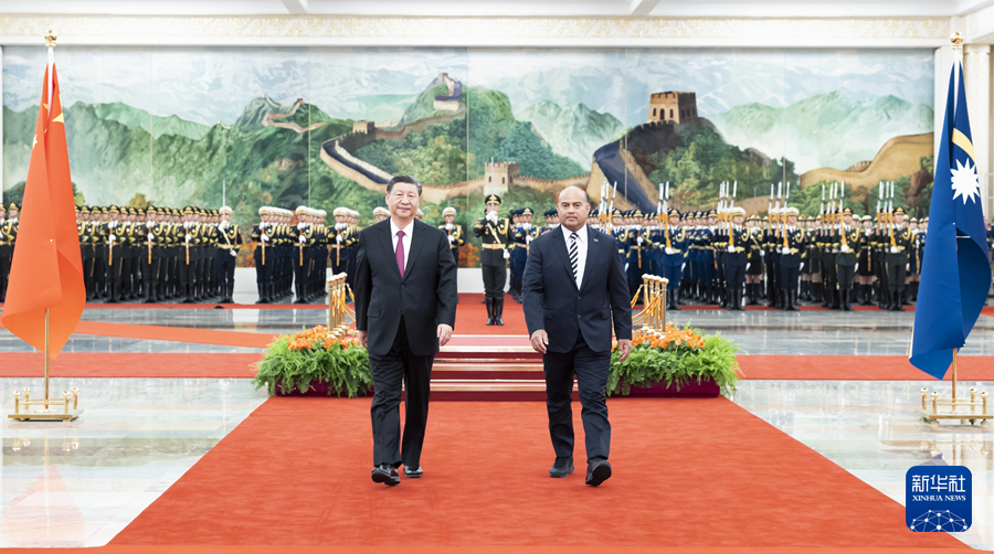 3月25日下午,國家主席習近平在北京人民大會堂同來華進行國事訪問的瑙魯總統(tǒng)阿迪昂舉行會談。這是會談前,習近平在人民大會堂北大廳為阿迪昂舉行歡迎儀式。新華社記者 黃敬文 攝 習近平指出,今年1月,瑙魯作出堅持一個中國原則、同中國復交的政治決斷,這是符合歷史大勢、順應時代潮流之舉。友好不分先后,只要開啟,就會有光明前途。合作不論大小,只要真誠,就會有豐碩成果。中瑙關系已經(jīng)翻開新的歷史篇章。中方愿同瑙方一道,開創(chuàng)中瑙關系的美好未來,更好造福兩國人民。