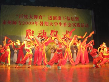 演出在群舞《歡聚一堂》中拉開帷幕,輕松歡快的旋律很快將近千名觀眾的情緒調動起來。 “家道它盼富裕,國運它盼昌盛,老百姓咱盼的是祥和萬事興……”一曲《咱老百姓》表達老百姓對黨和生活的熱愛與期盼。《如火的青春》以優美的舞蹈,深深吸引觀眾,將演出推向一個高潮。薩克斯獨奏《像我這樣的朋友》,二胡合奏《賽馬》,男生四重唱《中國軍魂》、《共青團之歌》等精彩節目輪番上演。演出現場高潮不斷,掌聲、喝彩聲一浪高過一浪。 演出結束后,黃橋鎮雙橋村農民王根有說,以前只在城里看過這樣的演出,現在“百姓大舞臺”來到鄉村為老百姓服務,想得真周到。他希望這樣的演出多一些下鄉。 今明兩天,“百姓大舞臺”將來到姜堰溱潼鎮、興化臨城鎮,送去文化“盛宴”。 |