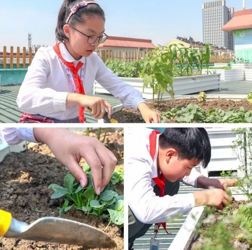 由于學校地處城區,面積較小,為了讓孩子們更加貼近自然,體驗勞動的樂趣,十年前,學校老師們集思廣益,在教學樓樓頂開辟了一塊實踐基地,將其命名為“空中百草園”。 時光荏苒,“空中百草園”已經成了學校勞動教育培訓基地,當然,這里也成了每個附小學子記憶深刻的那塊樂土。