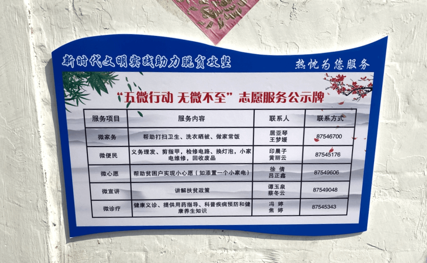 微家務(wù):“小時(shí)工”在線接單 脫貧攻堅(jiān)不止要扶貧,也要“撫”心。“多謝黨和政府對我們這些老人的關(guān)心,平時(shí)都是一個(gè)人,今天心里真是說不出的感動(dòng)。”葉文英平時(shí)一個(gè)人在家,缺少交流對象,志愿者為老人燒飯打掃,一起吃飯,讓溫暖與愛凝聚,把弘揚(yáng)孝老敬老融入到脫貧攻堅(jiān)。姚王鎮(zhèn)黨委關(guān)注貧困戶的精神需求,聚焦孤寡老人的生活層面,以“微家務(wù)”的形式為特殊人群做一頓家常飯、話一次家常、打掃一次衛(wèi)生、洗一次碗筷,以真心的陪伴送去溫暖與關(guān)愛。 微便民:“管家”面面俱到 在常態(tài)化的貧困戶走訪活動(dòng)中,姚王鎮(zhèn)黨委發(fā)覺有的建檔立卡戶出門不易,給日常生活造成了不便。對此,“五微行動(dòng)”建立健全便民服務(wù)體系,以姚王鎮(zhèn)團(tuán)委的青年志愿服務(wù)隊(duì)為主,建立起相對應(yīng)的資源庫。將志愿服務(wù)隊(duì)負(fù)責(zé)人的名單公示,張貼至全村所有建檔立卡低收入戶入戶醒目處,由村(居)新時(shí)代文明實(shí)踐站統(tǒng)一派單,各志愿服務(wù)隊(duì)隨時(shí)接單,常態(tài)化開展貼近群眾生活需要的志愿服務(wù)。