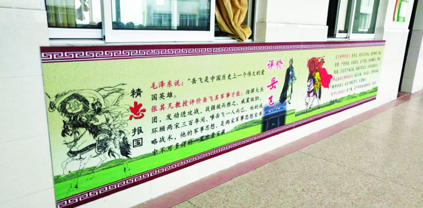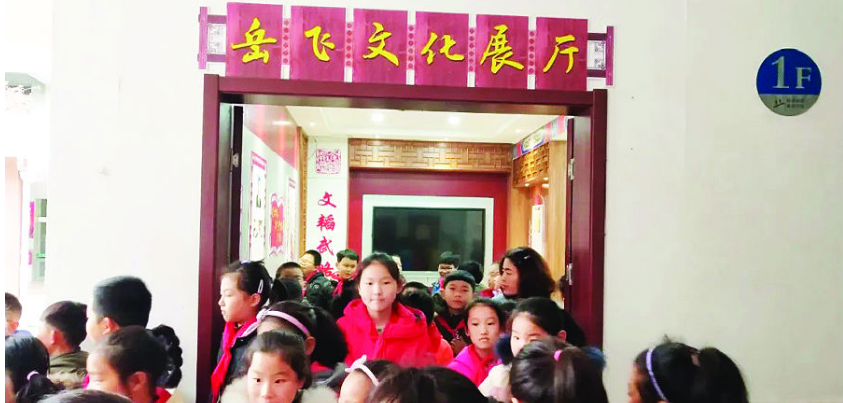 打造“岳飛魂”特色文化基地 通過物化,讓墻壁、教室、雕塑、長廊建設布置,將“岳飛魂”活靈活現、翔實可信地讓岳飛故事耳熟能詳,讓岳飛形象躍然眼前,讓岳飛精神撲面而來。學校精心構思,推進“四個一”環境建設。