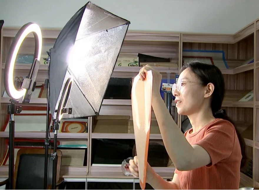 在永盛氟塑制品有限公司的展廳里,銷售人員化身網絡主播,在鏡頭前直播帶貨,同時現場用烤箱烤制餅干的方式全方位展現烤爐片的良好性能。永盛氟塑主要生產耐高溫布、硅膠烘焙墊等產品,2019年企業出口額達6000萬元,對于今年的網上廣交會,企業將推廣10種面對廚房燒烤類的新產品。