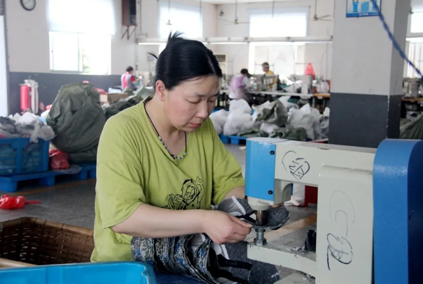 “嗒嗒,嗒嗒……”縫紉車間一片忙碌的景象,縫紉機不停轉動,經過走線、磨皮等程序,漂亮的鞋面逐步完成。