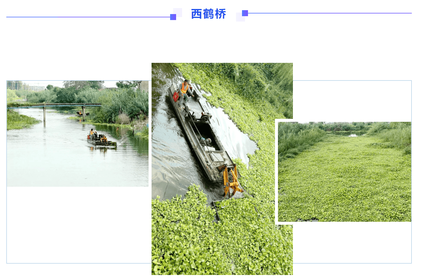 河失鎮(zhèn)司馬中溝爆發(fā)性增長的水生植物,幾乎覆蓋了整條河道,機(jī)械化保潔船不斷放下抄網(wǎng)進(jìn)行清理,船后是一百多米已經(jīng)清理干凈的河面。