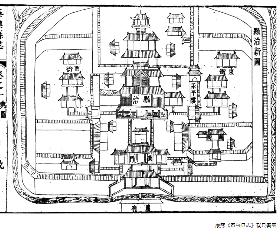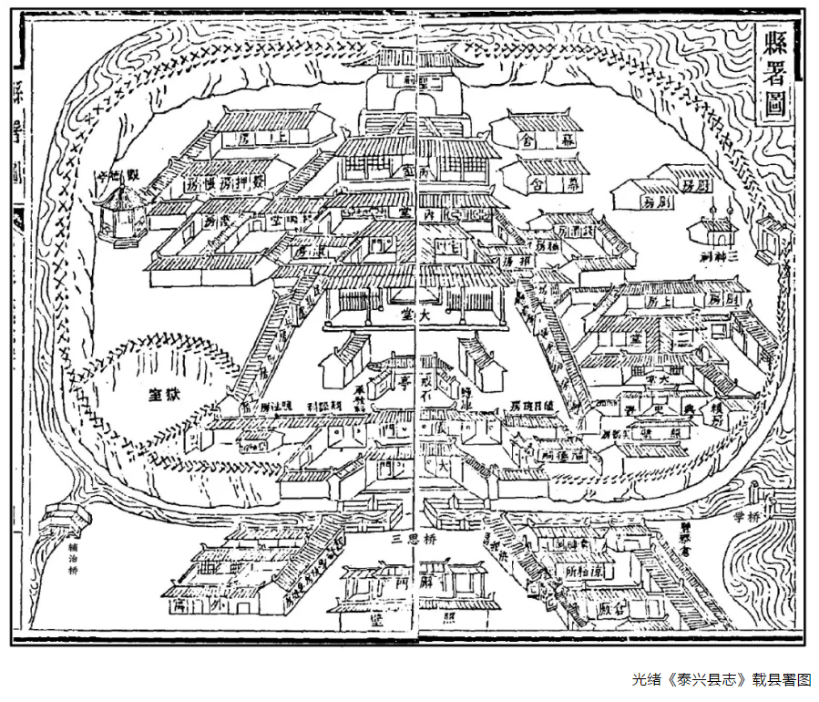 泰興縣治自南宋初由柴墟遷至延令,遂建縣衙,又稱縣署,后歷朝歷代多次修建增廣,至光緒年間縣衙的規模形制基本確定,機構功能一應完善齊備。