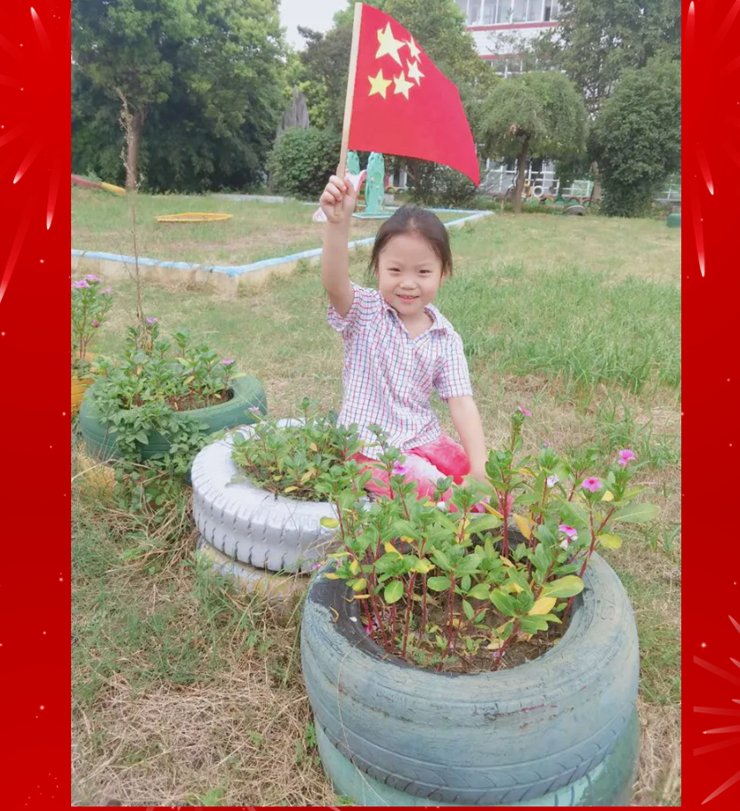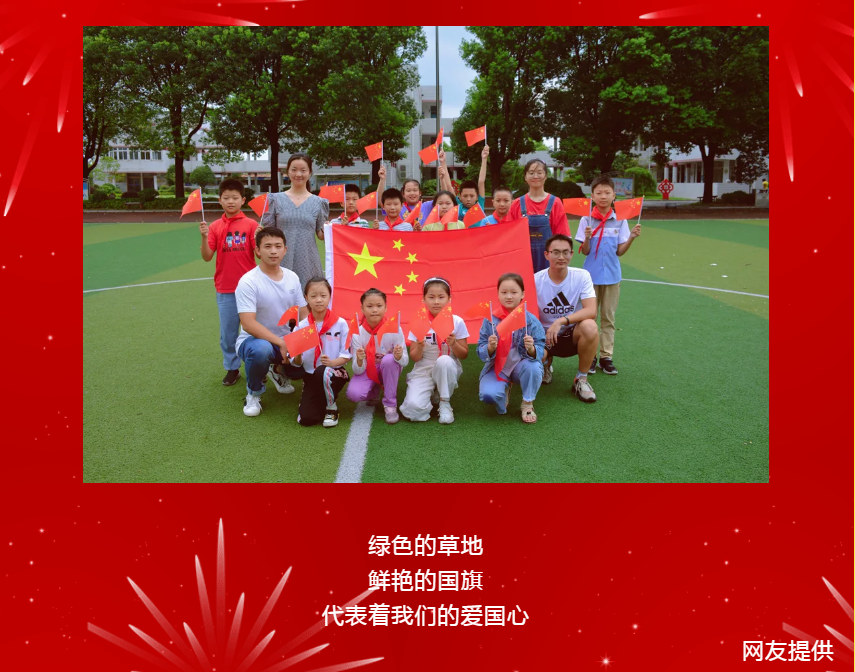 綠色的草地,鮮艷的國旗,代表著我們的愛國心!