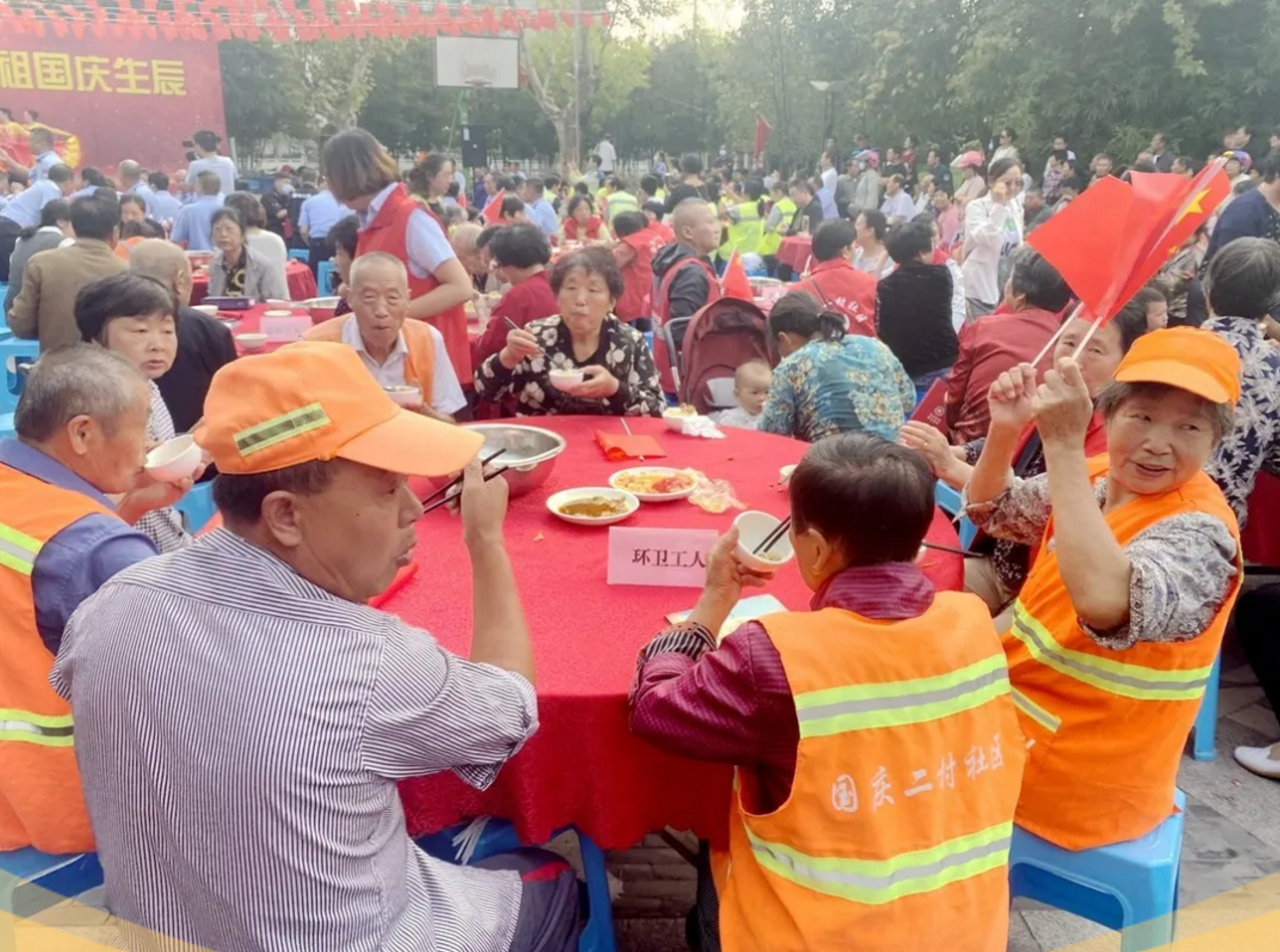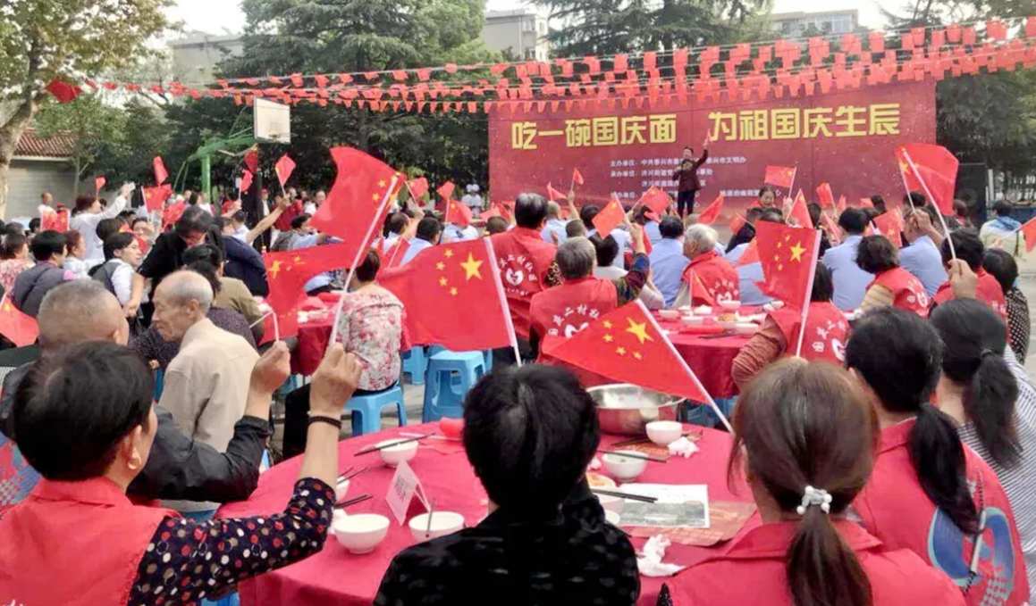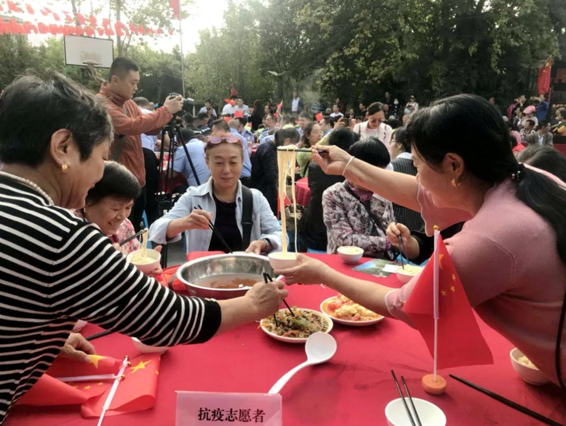 在中華人民共和國成立71周年之際,泰興市委宣傳部、文明辦、濟川街道、國慶二村社區(qū)、邀請市民同吃一碗“國慶面”。社區(qū)居民、醫(yī)護人員、人民教師、退伍軍人、環(huán)衛(wèi)工人、抗疫志愿者……來自各行各業(yè)的400多人,歡聚一堂,用同吃“一碗面”,這一最生活化的表達方式,為祖國母親慶祝生日。