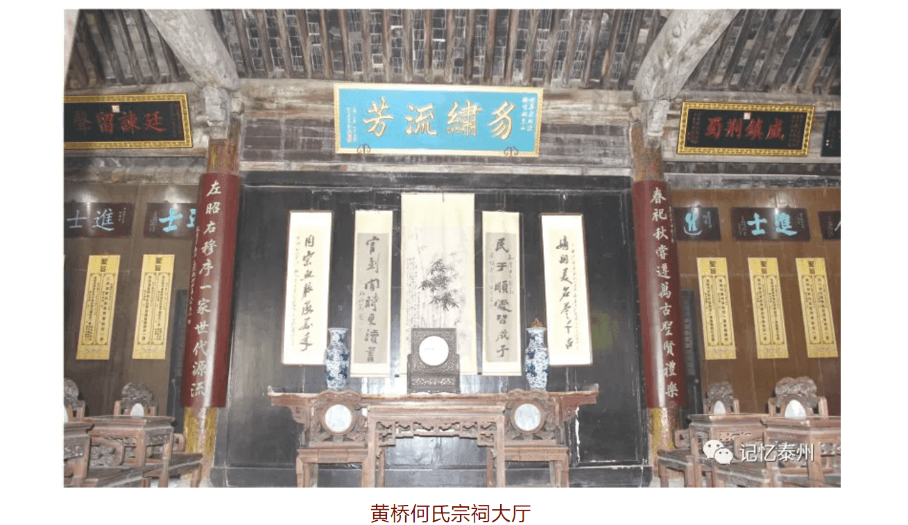 黃橋鎮的珠巷長約350米,歷史上珠巷稱豬巷,巷道兩側多是豬行,后來豬行外遷,取而代之的是各式商鋪。人們逐漸將豬巷改稱珠巷,1921年丁文江主持繪制的黃橋鎮區圖上就已經標注為“珠巷”。珠巷西邊有一深庭古院,為何氏宗祠。何氏制定《家范條件十則》,內容包括孝父母、友兄弟、謹夫婦、敘長幼、敦善行、訓讀書、獎行誼、崇節儉等,教育子孫立身處世、持家治學。何氏一族為詩書之家,子孫多“彬彬讀書,攻文辭,為儒者”,明清兩朝出4進士、11舉人、30貢生、300多秀才。清朝康熙時期的宰相張玉書曾為《何氏家乘》作序,譽黃橋何氏為“江左甲族”。新四軍東進黃橋后,在何氏宗祠設大眾俱樂部;黃橋決戰期間,在何氏宗祠設支前委員會,數萬燒餅集中于此,源源不斷送上前線。何氏宗祠坐北朝南,占地約1250平方米,建筑面積950平方米,現存明清時期建的房屋38間。設有大門堂、儀門、大廳、振裔樓等,雕梁畫棟,規制宏大,被譽為“江北第一祠”。