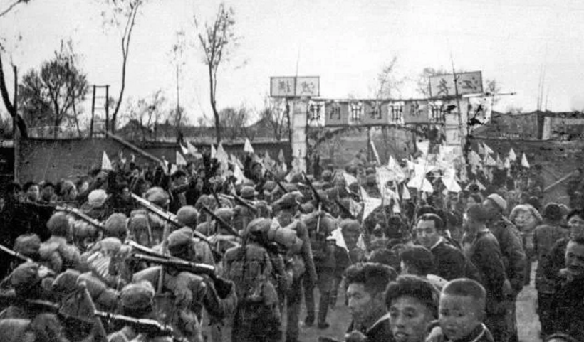 渡江戰(zhàn)役前夕抵達(dá)長(zhǎng)江北岸集結(jié)的第20軍指戰(zhàn)員進(jìn)駐泰州,受到當(dāng)?shù)厝罕姷臒崃覛g迎