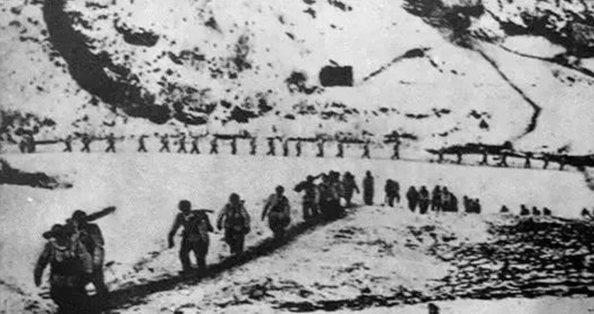 志愿軍第20軍第58師冒著嚴(yán)寒向戰(zhàn)區(qū)挺進(jìn)