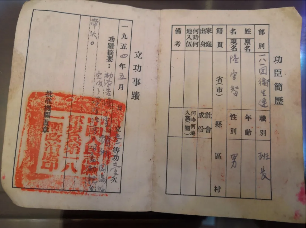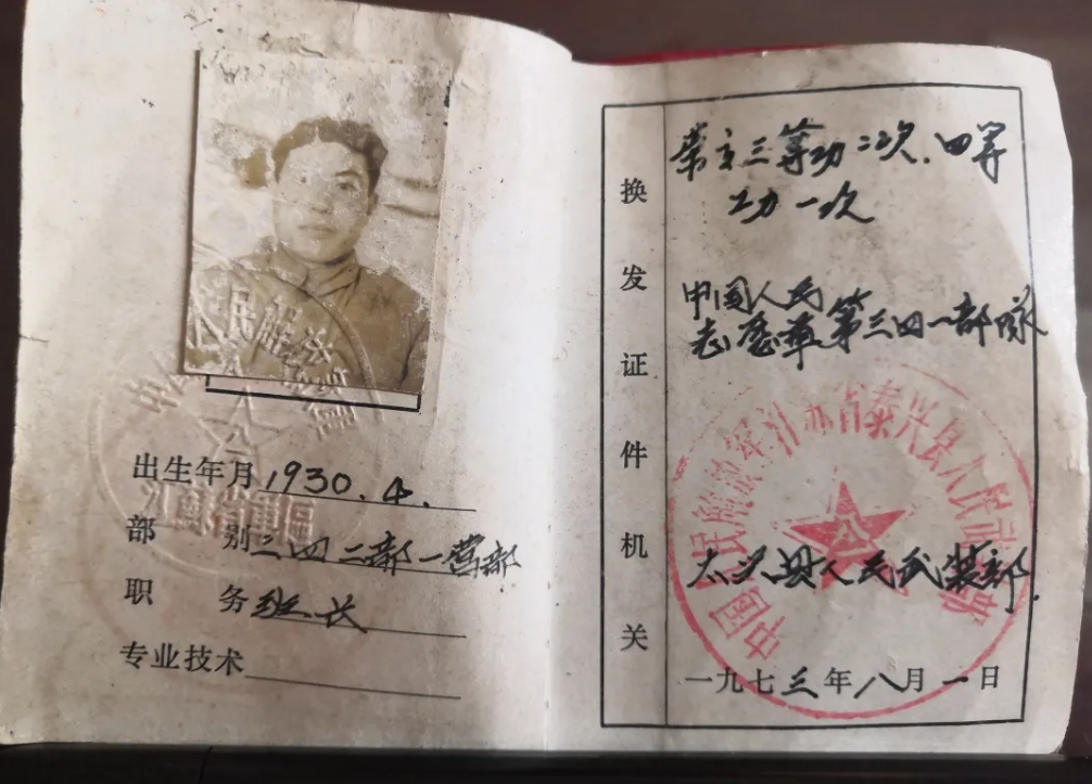 翻看其中一本紅色的小本子,爺爺的照片因為時間久了,已經受潮變花。紅本子是泰興縣人武部于1973年8月1 日換發的,里面列明了爺爺所處部隊的部別、職務及立功情況。