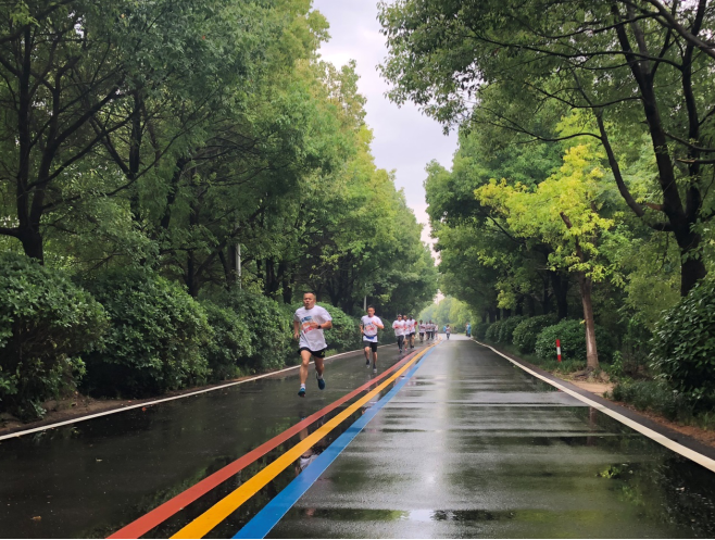 圖為參加“多彩宣堡 青春暢跑”迷你馬拉松比賽的選手正在“彩虹路”上賽跑
