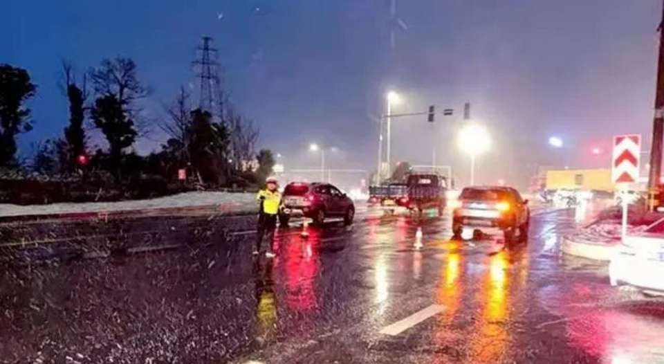 (江平路上,張橋中隊交警冒雪指揮交通)