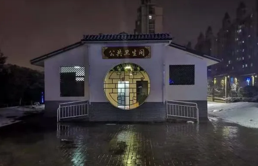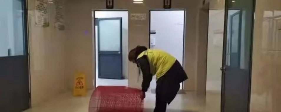 (公共衛生間內,環衛工人連夜鋪設防滑墊)