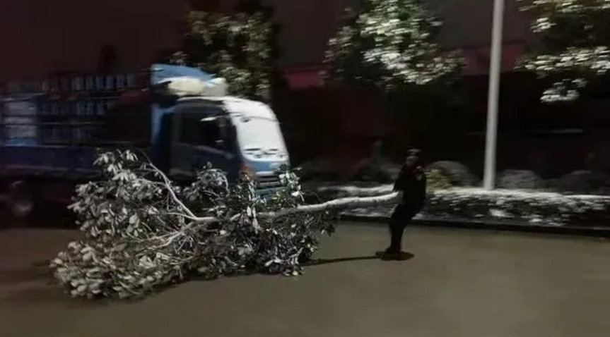 (城區工業園區,民警將倒下的樹木移開)