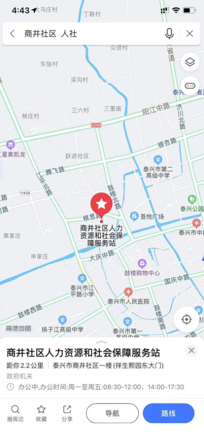 “人社電子地圖”功能借助高德電子地圖開放接口,實現泰興市級、鎮街、社區(村)人社三級服務網絡公共服務機構電子地圖定位,具有直觀、可視的特點。高德地圖用戶只需搜索所在的村或社區加關鍵詞“人社”,就可以獲取最近的人社服務站地點。地圖不僅能提供就近辦事地點查詢及路線導航的服務,還提供服務機構詳細地址、辦事時間及服務事項等信息,為辦事群眾及企業提供更為清晰明確的指引。