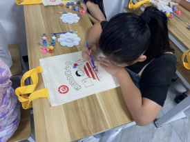 “籽籽同心”少數民族志愿者老師帶領孩子領取繪畫材料及帆布包,并以“民族團結一家親”“祖國在我心中”為主題,自由在帆布包上作畫。繪制圖案、涂抹上色,將純白底色變成畫板,孩子們精心地將帆布包變成“獨一無二”的非遺手工藝品。