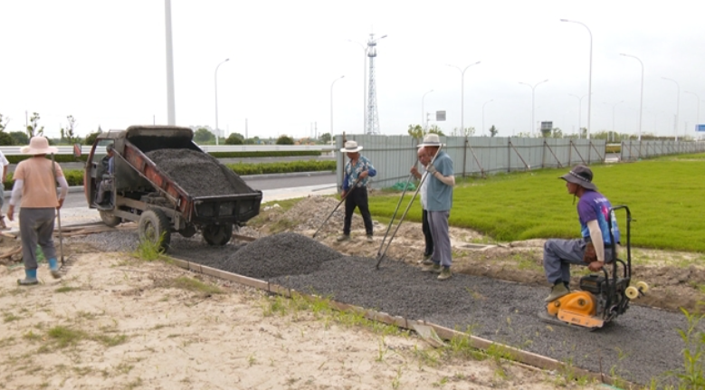 7月26日上午,在鎮海路南延綠化工程城區段,施工人員正在進行園路路基平整、壓實以及基層透水混凝土澆筑。截至目前,香樟、櫸樹、櫻花等喬木栽植已完成30%以上,城市驛站主體結構施工已經完成。城區段綠化工程北起334省道,南至前湯河,長約1.3公里,按城市綠化標準建設,苗木品種豐富,做到四季景觀鮮明有特色,造型別致有格調。綠地內將新建一條寬約3米,長約3.4公里的慢行步道以及長約2.2公里的濱水步道,并配套建設公廁、停車場、景觀雕塑以及五人制足球場、籃球場、健身廣場、乒乓球場等設施。“我們將搶抓工期進行園路、城市驛站、景觀廊架的施工,待氣溫合適時,展開大規模喬灌木栽植,全力提升城市南大門形象。”泰興市交通產業集團項目管理公司項目負責人何康說。