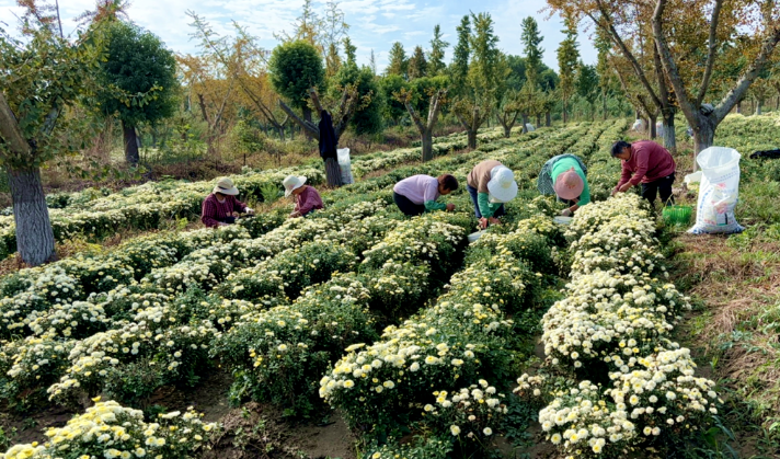 菊花種植產業是老葉村發展的“一村一品”特色產業。近年來,該村積極盤活土地資源,采取“黨支部+合作社+基地+農戶”的發展模式,大力發展菊花種植產業,帶動了100余名村民在家門口利用十邊隙地,穩定就業增收。菊花產業基地負責人肖興強介紹,今年種植的菊花有金絲皇菊、七月菊、香菊、北京菊、千層菊、晚菊共6種。現在采摘的是北京菊,1畝地產量大概1000公斤,產值4000余元。采摘期持續半個月,每天采摘人數有50多人,采摘量可達6噸。