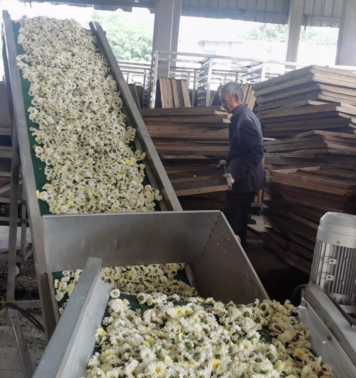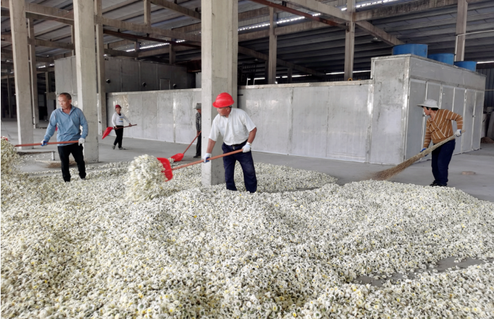 為了延伸菊花產業鏈,老葉村配套建設了菊花深加工車間,將剛采摘下來的菊花經過殺青、烘干、分揀、裝箱等工序后進行銷售,進一步提高菊花的產值。