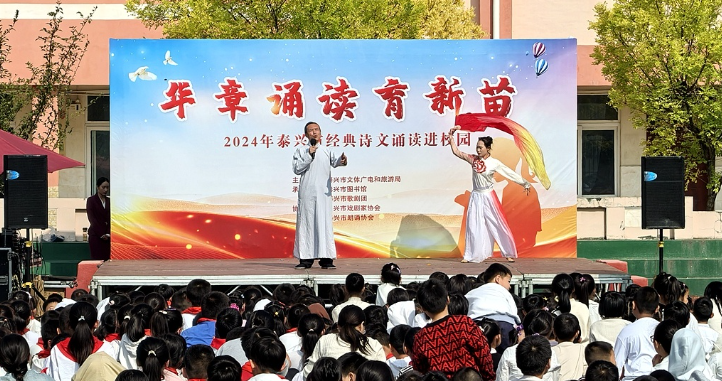 “明月幾時有,把酒問青天。不知天上宮闕,今夕是何年……”日前,在泰興市新街小學的操場上,一場以“華章誦讀育新苗”為主題的經典詩文誦讀活動吸引了眾多師生的目光。學生們全情投入,沉浸在古詩詞《望月懷遠》《水調歌頭·明月幾時有》以及現代詩詞《千年銀杏萬年月》、現代舞臺詩詞劇《英雄》等作品的誦讀之中,享受了一場穿越時空的文化之旅,深刻感受到了濃厚的家國情懷。