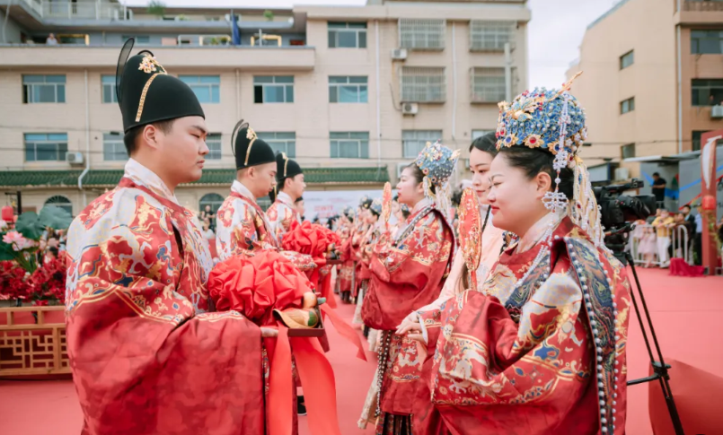 泰興市還注重優(yōu)化宴席辦理服務(wù),打造村民集中辦事場所,為群眾集中操辦、規(guī)范操辦紅白喜事提供便利。今年,泰興市還舉行了以“泰”想遇見你為主題的中式集體婚禮,9對新人在傳統(tǒng)婚禮典禮中完成了他們的婚姻大事,這不僅讓新人們體驗到了中國傳統(tǒng)婚禮的深厚文化底蘊(yùn),也踐行了文明婚俗新禮儀。