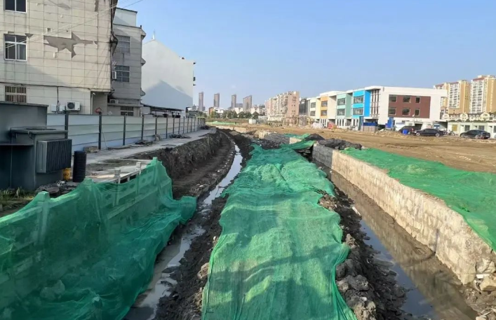 在香戴河貫通工程現(xiàn)場,預制水泥樁已完成打樁,施工人員正在綁扎掛板鋼筋,制作擋墻模板,為下一步混凝土澆筑做準備。該項目西起桑木河,東至東郊人工湖,重點實施380米原河道駁岸整治,新建鋼筋混凝土擋墻駁岸,并將新開挖河道約180米,以溝通水系,消除河道斷頭現(xiàn)象。河道兩岸還將進行配套建設,包括透水混凝土園路、欄桿、休閑座椅以及河坡綠化,旨在打造錯落有致的河岸景觀。