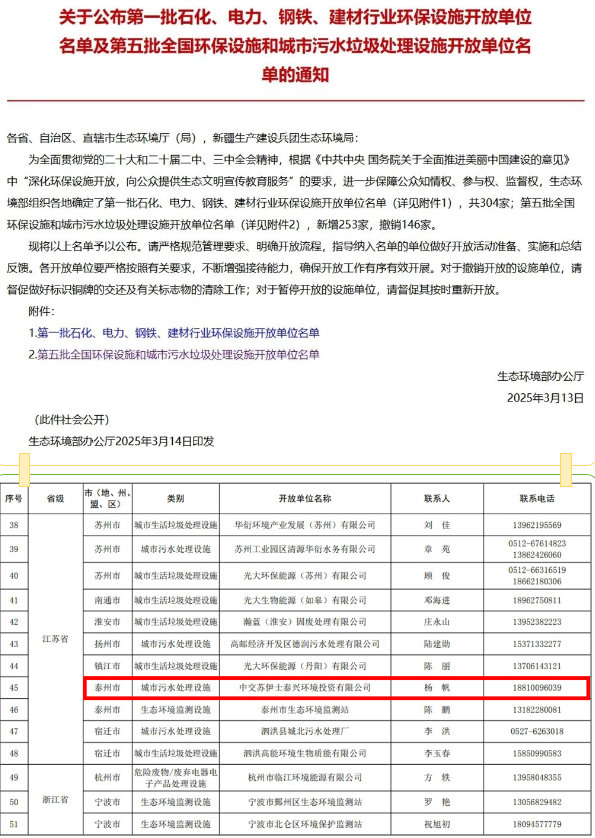 近日,生態(tài)環(huán)境部辦公廳公布了第五批全國環(huán)保設(shè)施和城市污水垃圾處理設(shè)施開放單位名單,中交蘇伊士泰興環(huán)境投資有限公司(以下簡稱“中交蘇伊士”)正式成為全國環(huán)保設(shè)施開放單位。