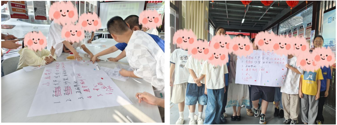 活動首先以“你劃我猜”破冰游戲消除陌生感,引導兒童自主制定小組契約。工作人員通過“重復提案鼓勵機制”,如“大膽說出,不考慮重復”,激發兒童規則共建參與率100%,形成可視化行為公約。 二、游戲化教學,破解知識壁壘