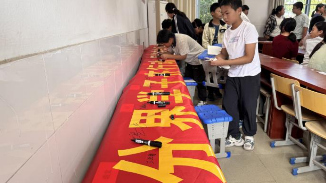 講座結(jié)束后,活動(dòng)進(jìn)入宣讀《網(wǎng)絡(luò)安全倡議書》環(huán)節(jié)。學(xué)生代表何雨桐手持倡議書,以鏗鏘有力的聲音,向全體參與同學(xué)發(fā)出倡議,呼吁大家自覺遵守網(wǎng)絡(luò)法律法規(guī),樹立正確網(wǎng)絡(luò)價(jià)值觀,抵制不良網(wǎng)絡(luò)信息,保護(hù)個(gè)人信息安全,積極營造健康、文明、安全的網(wǎng)絡(luò)環(huán)境。在老師的引導(dǎo)下,初一年級(jí)的同學(xué)們鄭重地在橫幅上簽下自己的名字。筆尖落下的不僅是一個(gè)個(gè)姓名,更是同學(xué)們對(duì)踐行網(wǎng)絡(luò)安全承諾的堅(jiān)定決心——承諾將所學(xué)的網(wǎng)絡(luò)安全知識(shí)運(yùn)用到日常上網(wǎng)生活中,主動(dòng)抵制網(wǎng)絡(luò)不良信息,守護(hù)個(gè)人信息安全,帶動(dòng)身邊人共同維護(hù)健康的網(wǎng)絡(luò)環(huán)境。