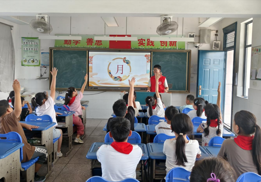 飛花令里品詩韻,少年才情競芳華。廣陵小學(xué)的教室里,同心圓夢志愿者正帶領(lǐng)孩子們開展“月滿中秋·詩詞飛花令”活動(dòng)。“小時(shí)不識月,呼作白玉盤”“窗前明月光,疑是地上霜”“月落烏啼霜滿天,江楓漁火對愁眠”……孩子們爭相舉手搶答,一句句經(jīng)典詩詞脫口而出,現(xiàn)場掌聲不斷。志愿者們?yōu)榇饘Φ膶W(xué)生送上印有中秋圖案的精美書簽,鼓勵(lì)他們多讀經(jīng)典、傳承文化。倪榮輝同學(xué)興奮地說:“以前只覺得月亮是圓的,今天學(xué)了這么多‘月’的詩句,才發(fā)現(xiàn)月亮里有這么多故事!”活動(dòng)以詩為媒,讓孩子們在競技中感受詩詞之美,厚植文化自信。