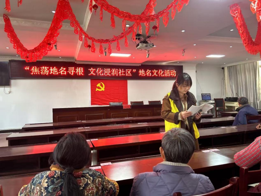 活動(dòng)開始,張橋鎮(zhèn)民政服務(wù)站工作人員結(jié)合史料記載與民間傳說,深度解讀“焦蕩”地名的起源與演變---從移民拓荒的煙火傳奇到抗戰(zhàn)時(shí)期的紅色記憶,從地理特征的生動(dòng)寫照到人文精神的代代傳承,同時(shí)串聯(lián)周邊關(guān)聯(lián)地名,勾勒出完整的本土地理文化脈絡(luò),讓村民們深刻理解地名并非簡(jiǎn)單代號(hào),而是鐫刻歷史的活態(tài)密碼,更是承載民俗習(xí)慣與價(jià)值觀念的文化載體。