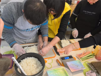 壽司手作時光 感受創造的喜悅 技能培訓結束后,壽司老師的到來為活動增添了更多趣味。老師先向孩子們介紹壽司的起源與食材知識,隨后展示卷簾壽司的制作步驟,從米飯的鋪展、食材的搭配到卷制力度的掌控,每一個細節都耐心示范、細致講解。“米飯要鋪得薄而均勻,不然卷的時候會散開”“黃瓜和胡蘿卜要切得粗細一致,這樣口感更好”,孩子們圍在桌前認真傾聽,眼神中充滿期待。 實操環節中,孩子們在老師和志愿者的手把手指導下,小心翼翼地鋪米飯、放食材、卷卷簾,雖然動作略顯笨拙,但每個人都格外專注。有的孩子反復練習卷制技巧,有的孩子創意搭配食材,現場歡聲笑語不斷。當一個個形態各異的壽司完成時,孩子們臉上洋溢著滿滿的成就感,主動將自己的作品分享給同伴和老師,在分享中感受合作的溫暖與成功的喜悅。老師對每個孩子的作品都給予肯定與點評,引導他們珍惜食物、享受勞動成果。