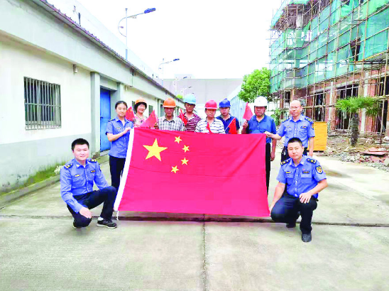 ![]() 市城市管理綜合執法大隊的隊員們來到建筑工地,和建筑工人們一起與國旗合影。
