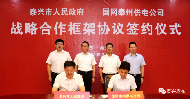 8月20日下午,泰興市人民政府與國網泰州供電公司簽署戰略合作框架協議,加快推進泰興新型電力系統建設,加強泰興地區供電保障能力。市委書記張坤,國網泰州供電公司總經理徐春社,我市領導劉輝、孫紅東出席簽約儀式。